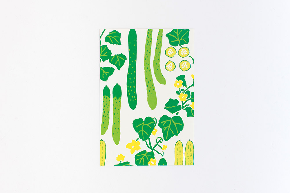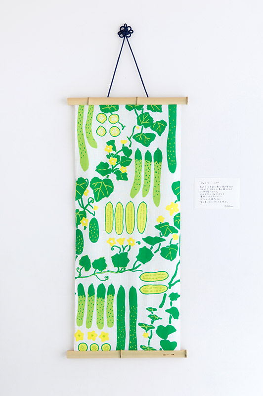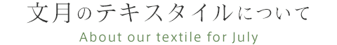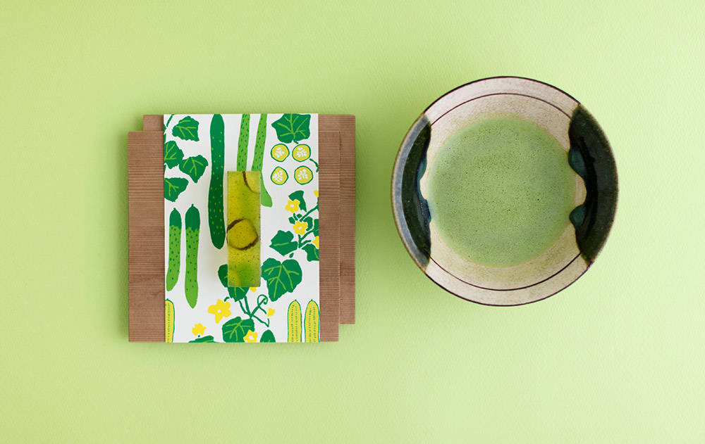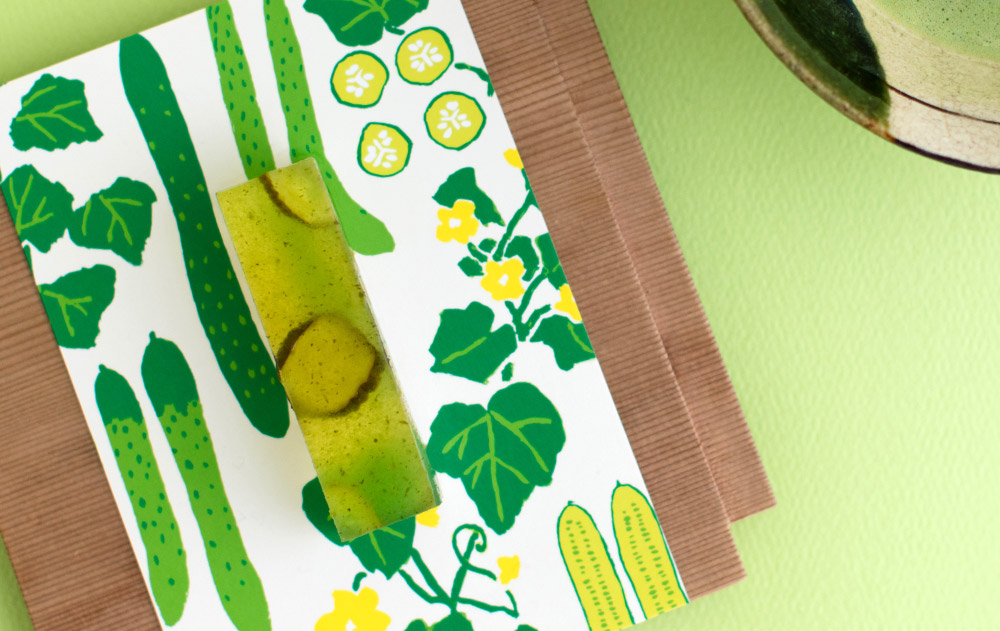 7月のテキスタイルデザインは、きゅうりです。透き通った錦玉羹を二層仕立てにして、旬のきゅうりの瑞々しさを表しました。