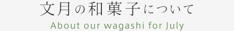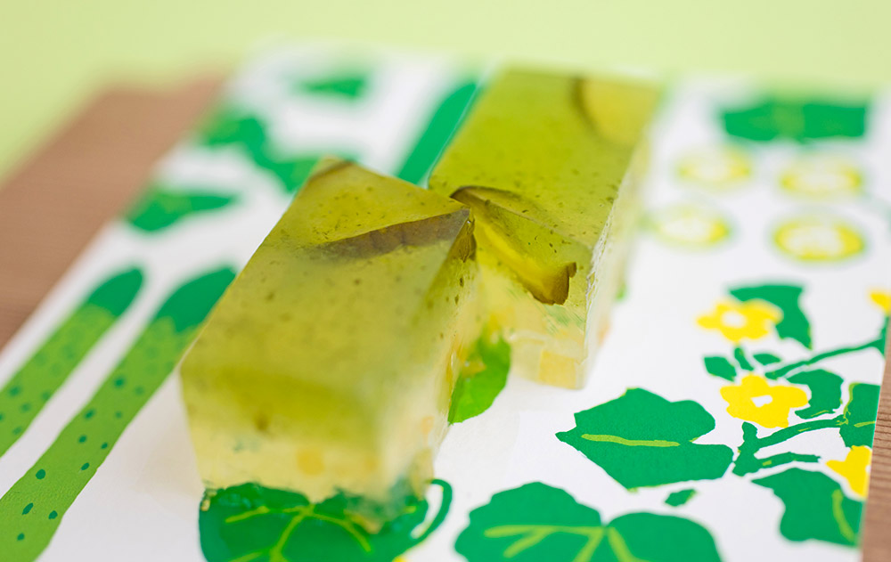 July's textile design is kyuri(cucumbers). This wagashi has two transparent layer made of kingyokukan, agar-agar and sugar melted together and chilled, to show the dew of cucumbers in the season. The top layer consists of cucumber paste mixed with honeyed lemon and Japanese plum brandy, with slices of lemon-soaked cucumbers.