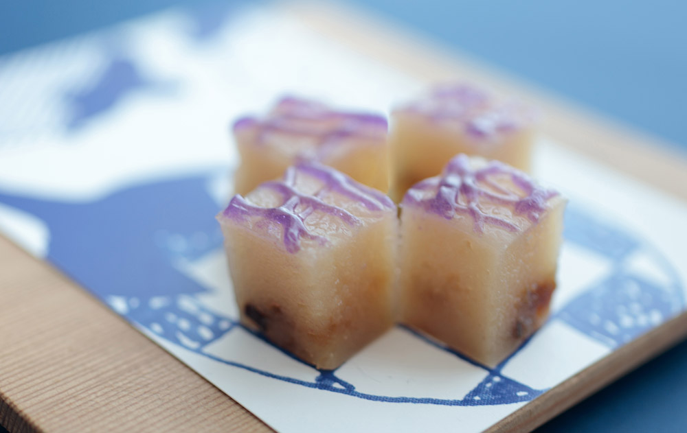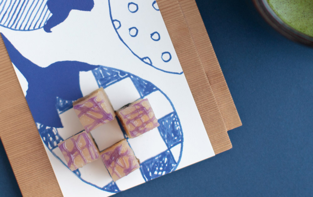 図案のサイズにに合わせて賽の目に切り分け、茄子紺色に染めた錦玉羹を絞り出して模様を描きました。キャラメリゼした焼き茄子と白味噌の相性が良い、風味豊かな葛焼きに仕上がりました。