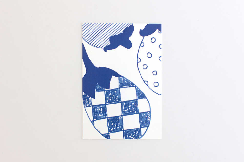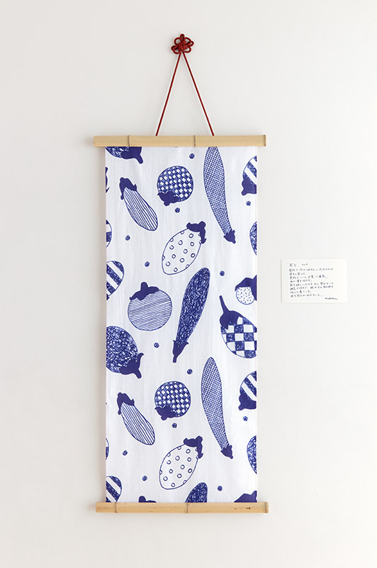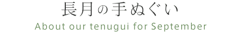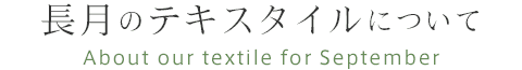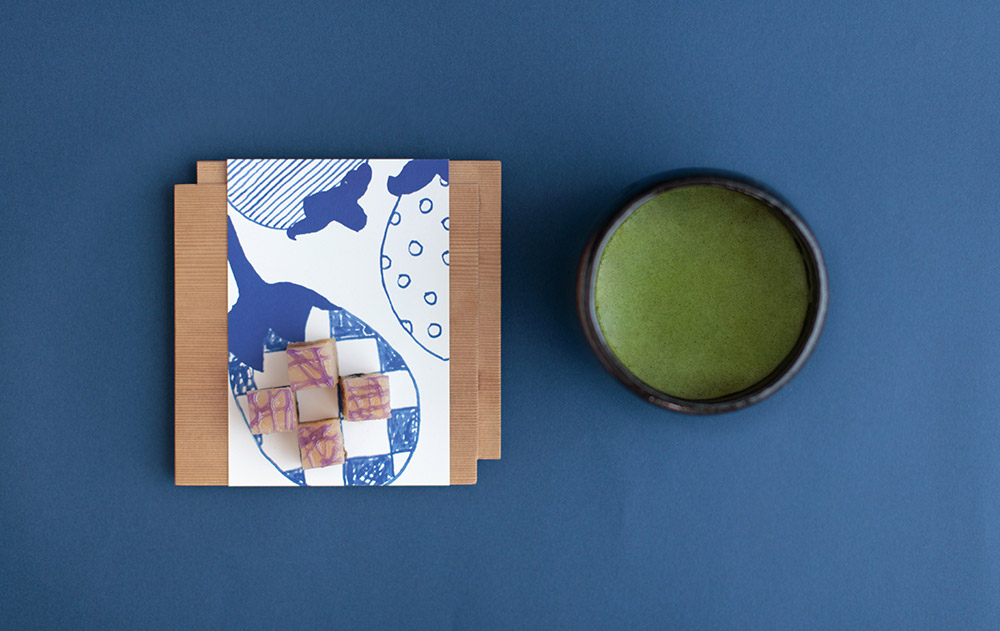 We made autumn flavor "kudzu-yaki"(baked kudzu starch jelly), using the fragrant of grilled eggplants. It is made of kudzu from Yoshino, mixed with white sweetened bean paste, white miso paste and grilled eggplants. It is steamed in a pan, coated with flour, and baked until it gets burn mark. It is cut into cubes to fit the textile design and nasu-kon(navy blue) colored kingyokukan, agar-agar and sugar that was melted and chilled, is squeezed to decorate patterns on them. Caramelized grilled eggplants and white miso paste go great together; that makes them rich flavored kudzu-yaki.