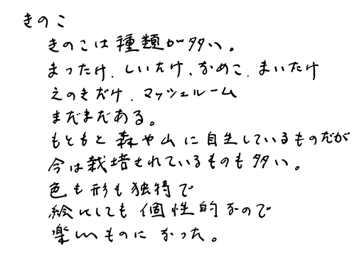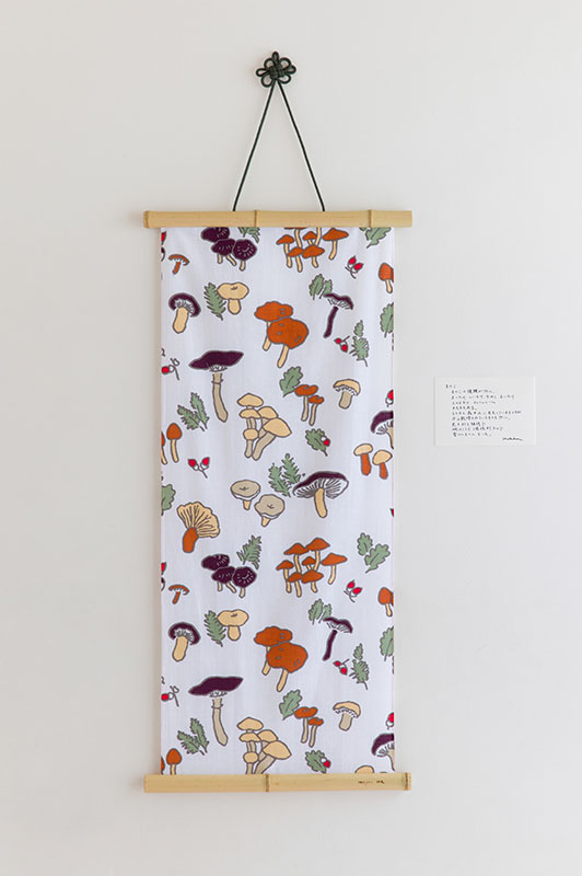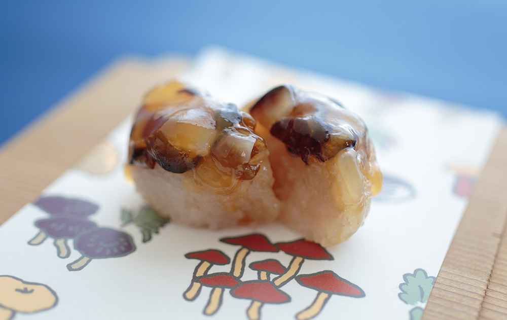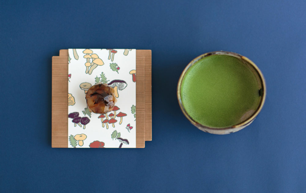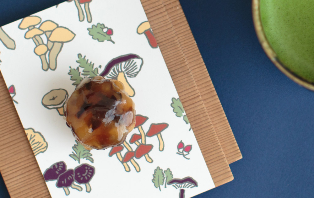 November's textile design is about mushrooms. We made up a novel wagashi, a traditional Japanese confectionary, using four different kinds of mushrooms: simeji, nameko, eringi, and shiitake. Sweetened white bean paste is wrapped with doumyouji, a kind of rice cake (mochi) mixed with walnuts. Mushrooms on top were soaked in syrup and semi-dried. As a finishing touch we put mitarashi-dare over it, which is a sweet soy glaze made of soy sauce, a kelp, syrup and kudzu vine from Yoshino. The sauce is heated up a little to produce a smooth taste and texture.