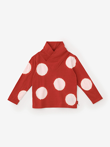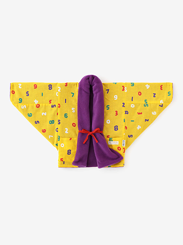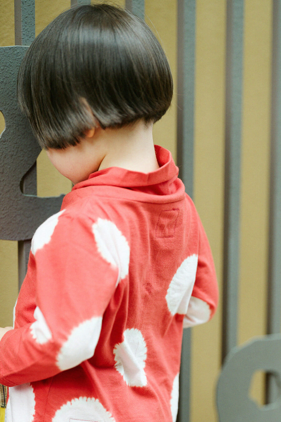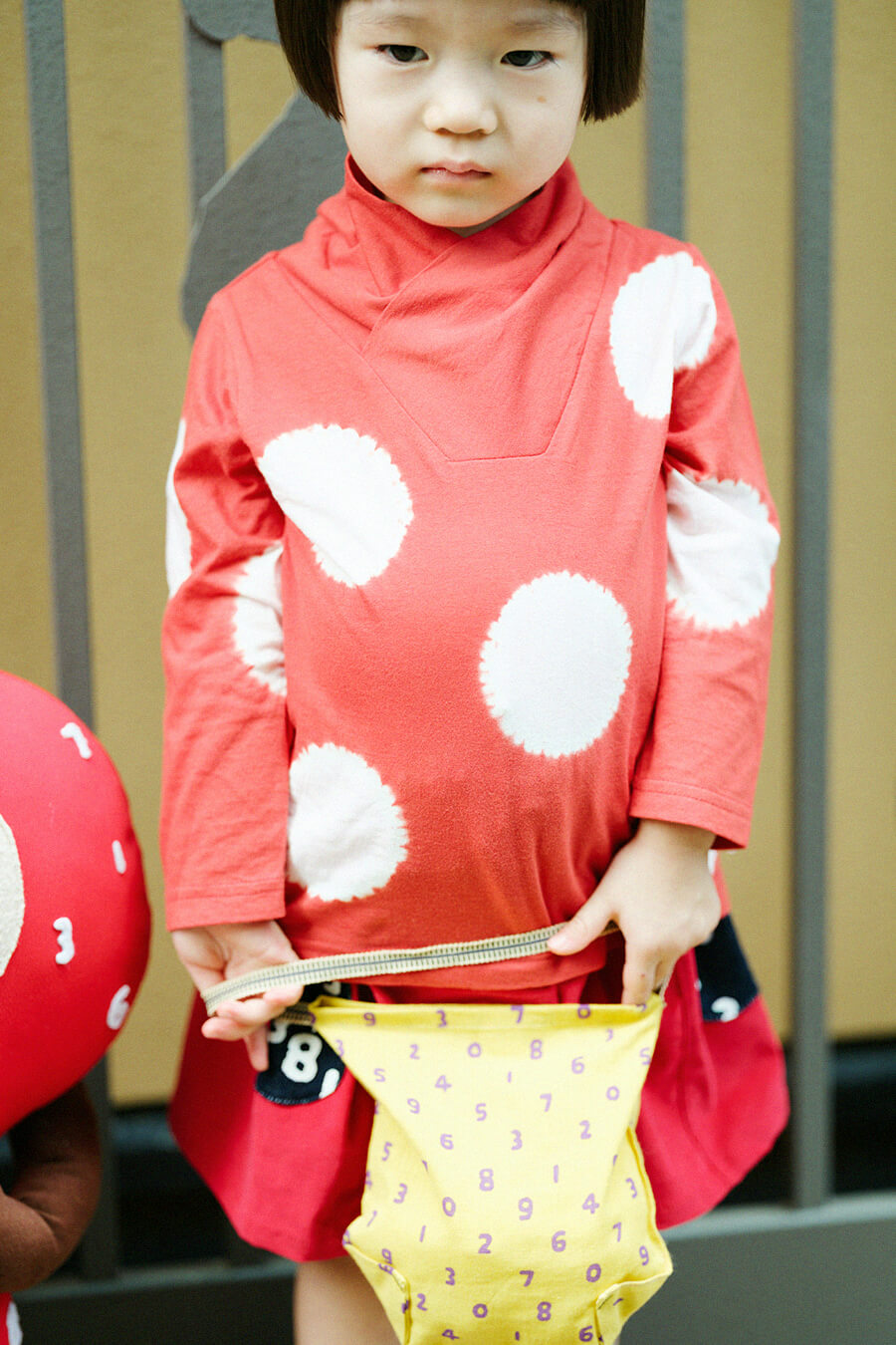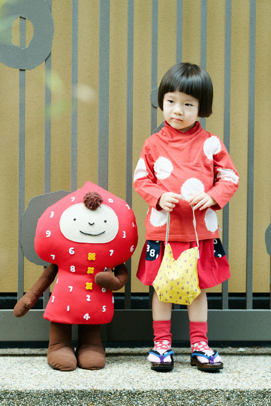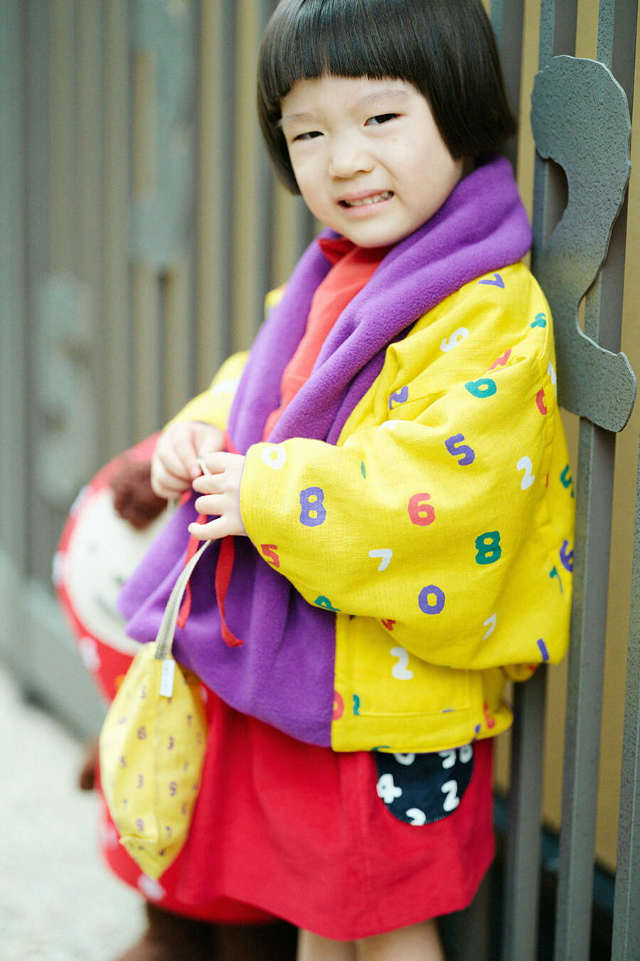 もじりそでのテキスタイルデザイン名「そすうごぎょう つち」の「五行 土」は神社の五色絹などで馴染みのある五色の一つで、厄除けやご利益があるとされています。縁起がよく、ビタミンカラーで元気いっぱい&可愛さ弾けるコーディネート。