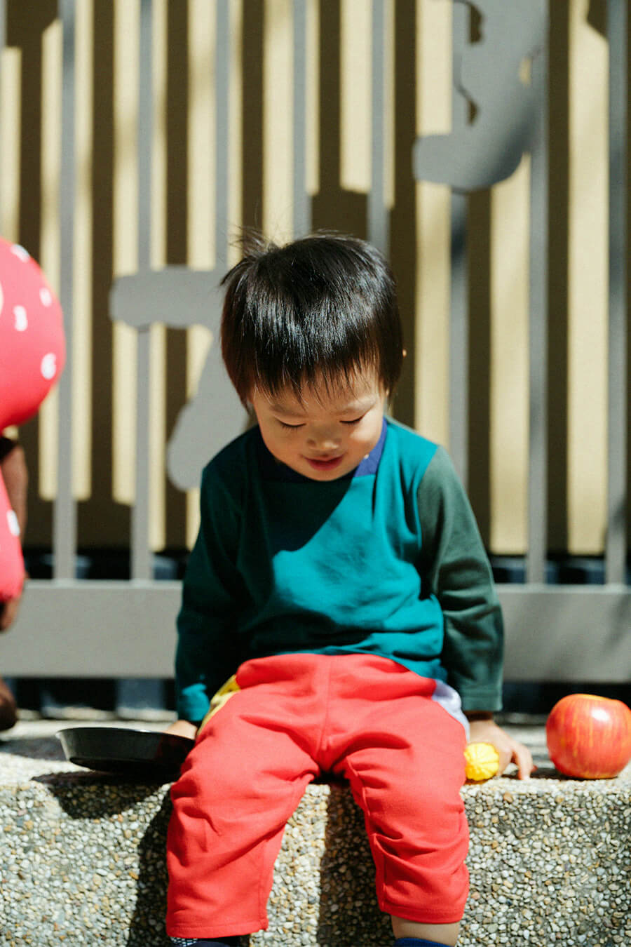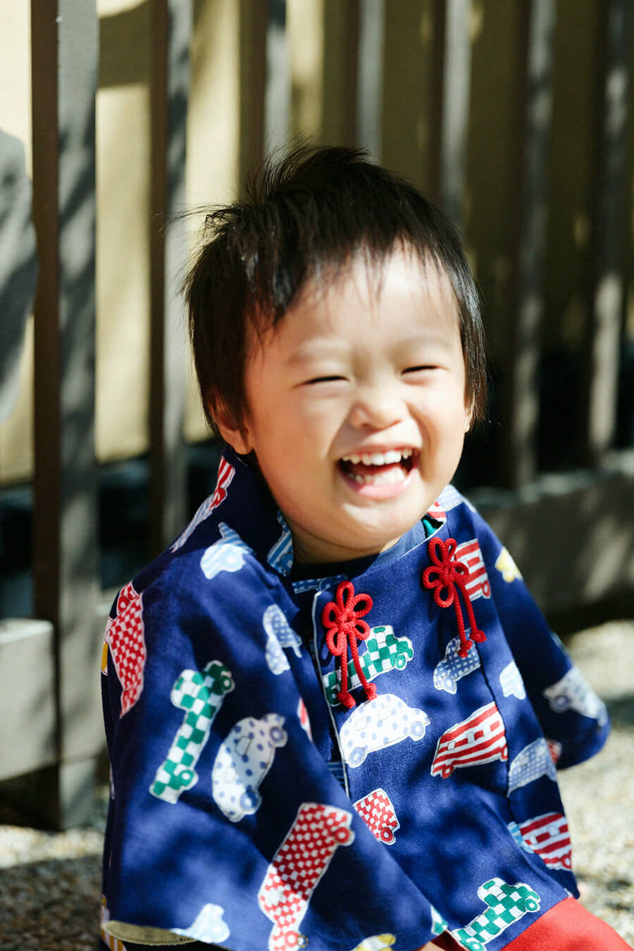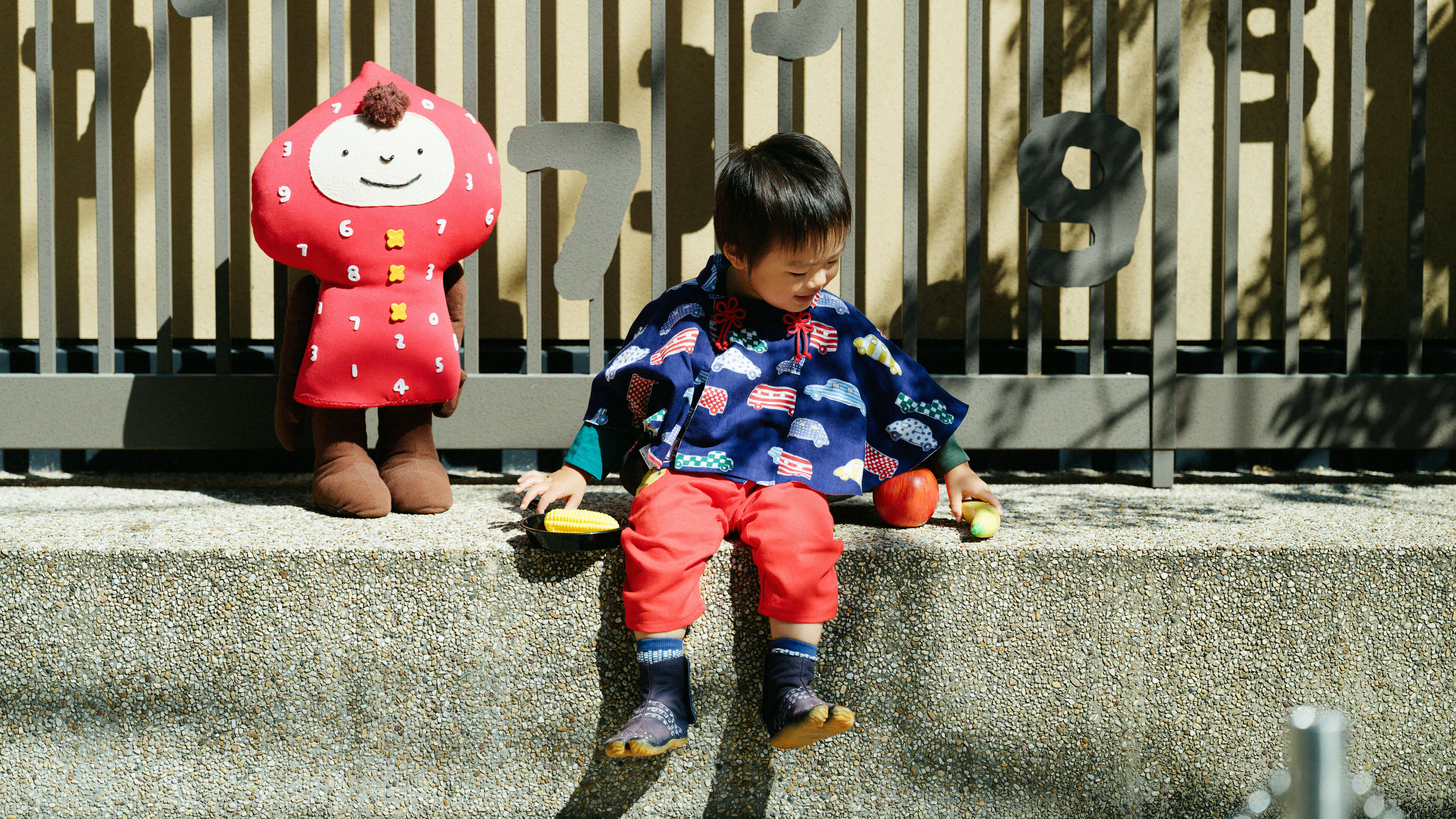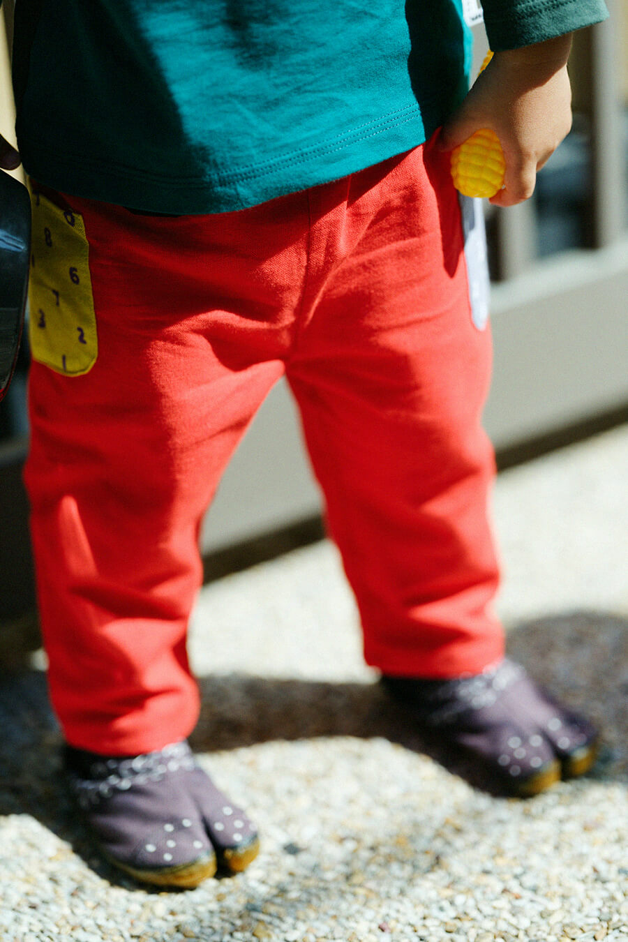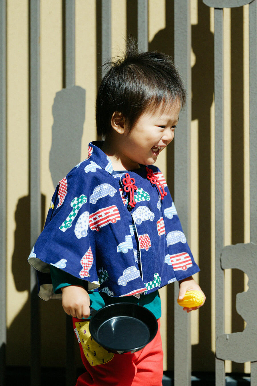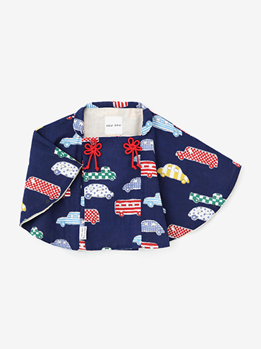 みんな大好きな「じどうしゃ柄」のポンチョひふ。パッと鮮やかな赤色のパンツで子供らしく元気に。着心地のよい伊勢木綿アイテムで自然と笑顔に。