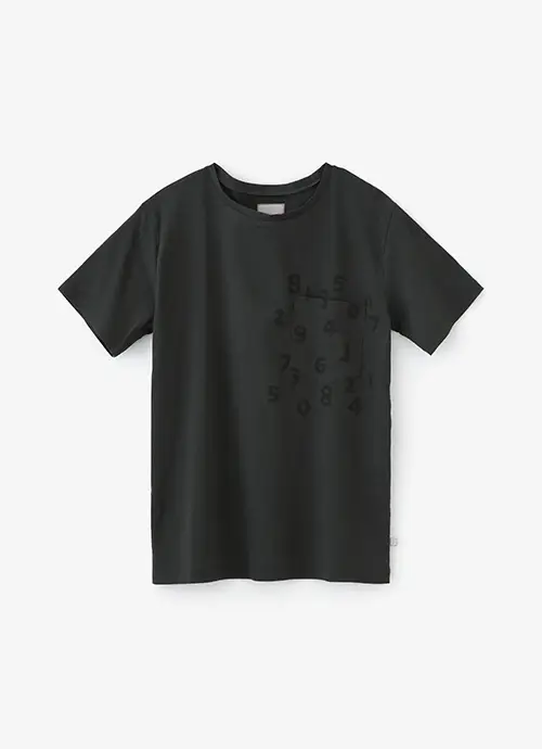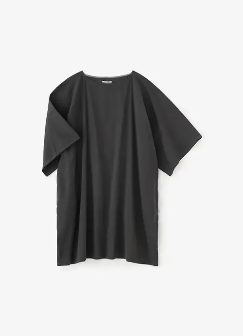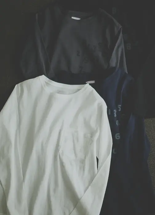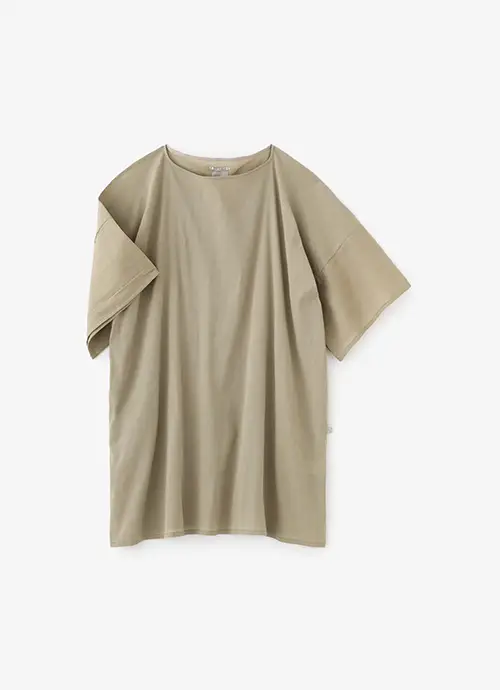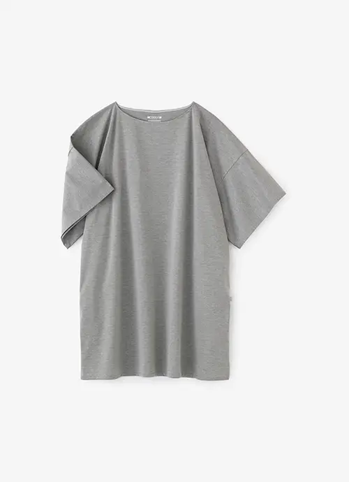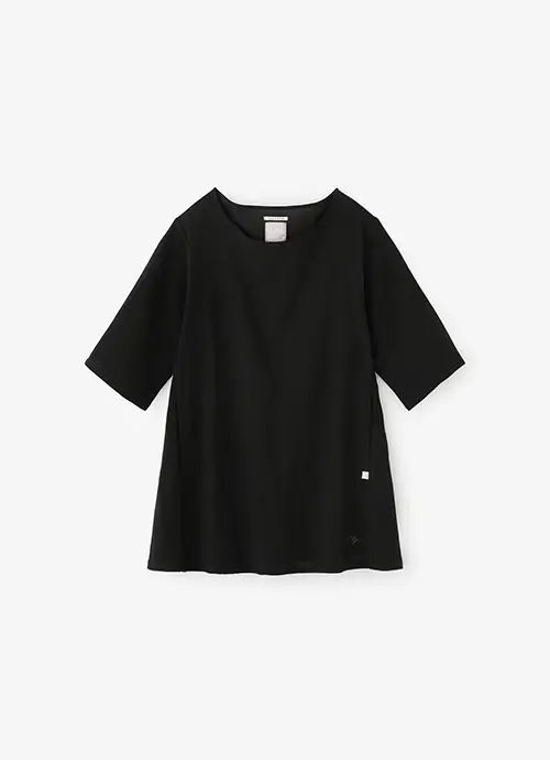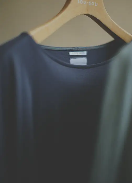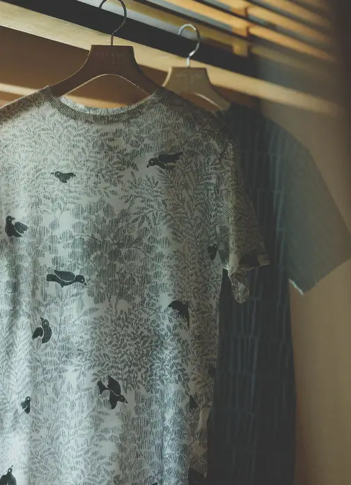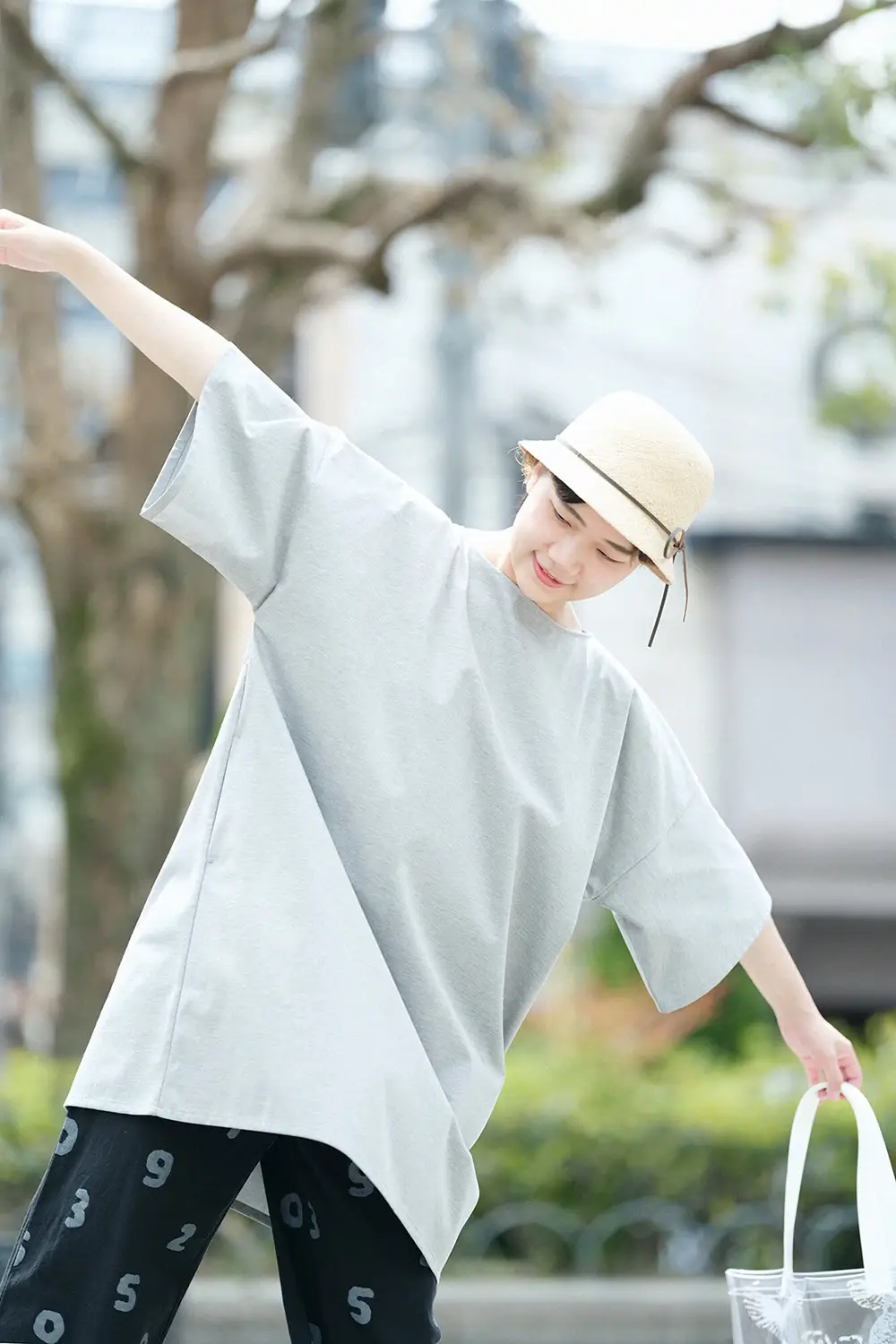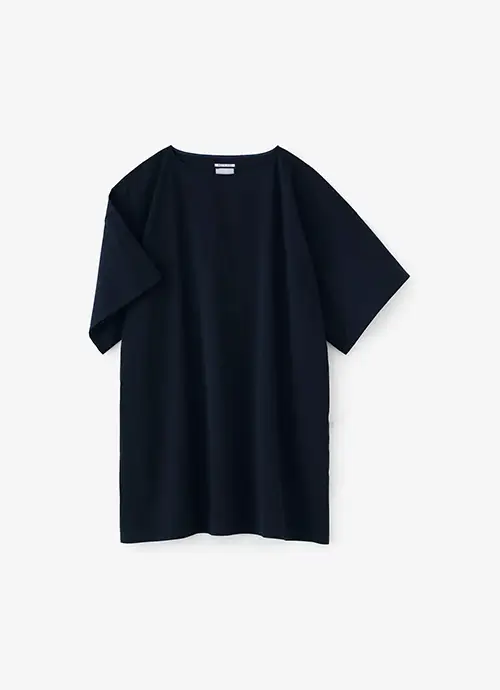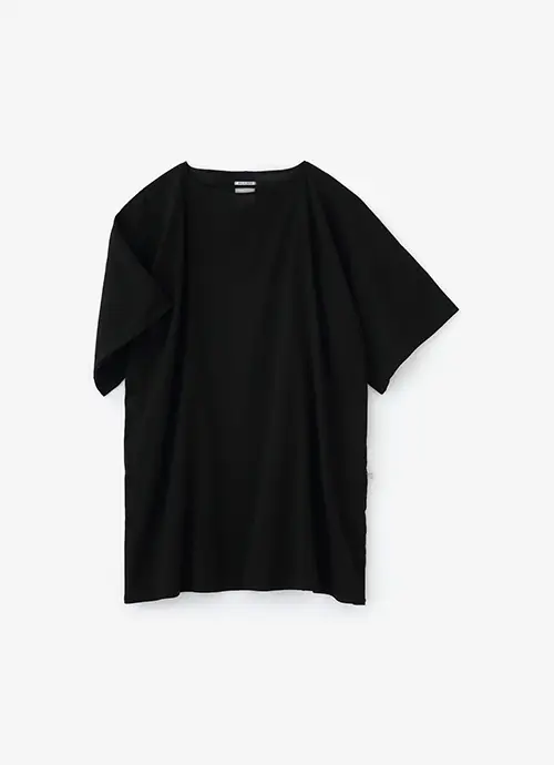 着心地抜群のTシャツはモノトーンでシックに。素材は高温多湿な日本の夏にも最適、「高島縮」。