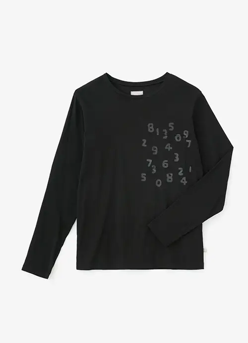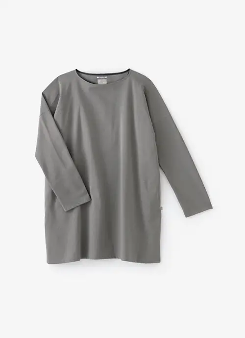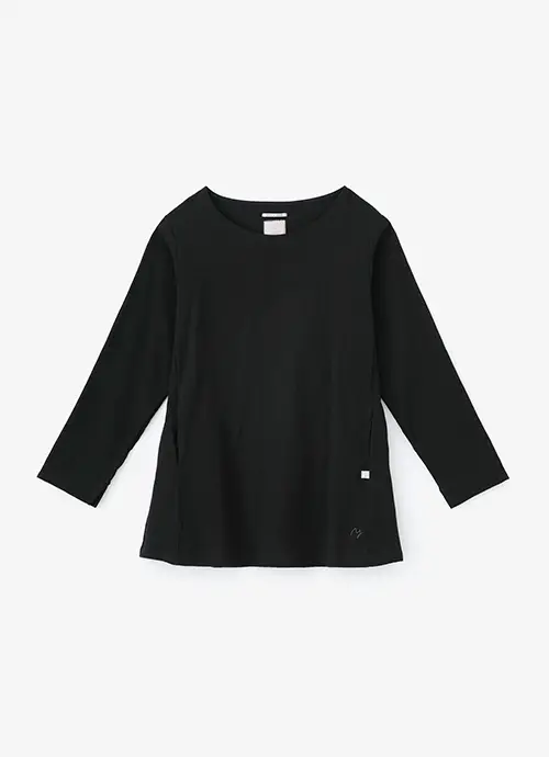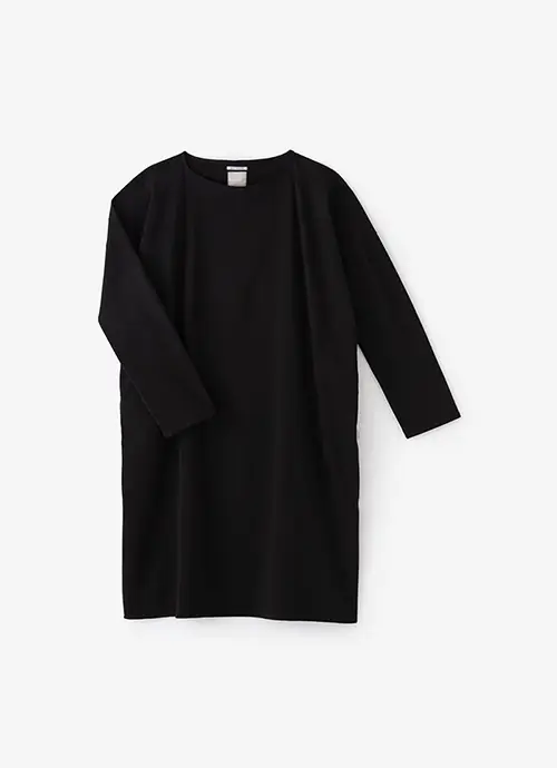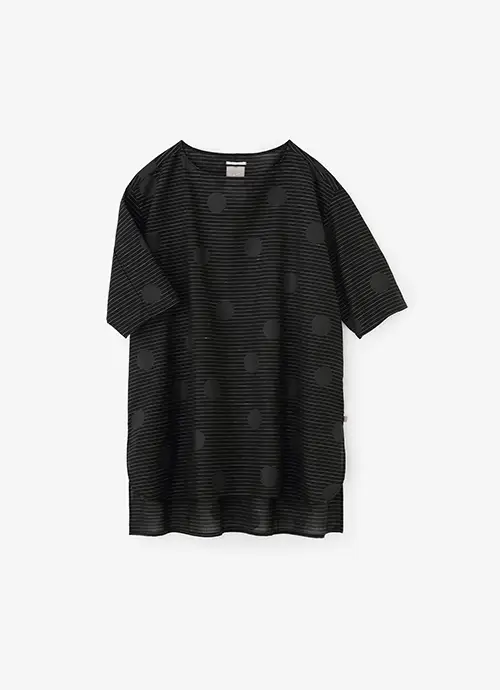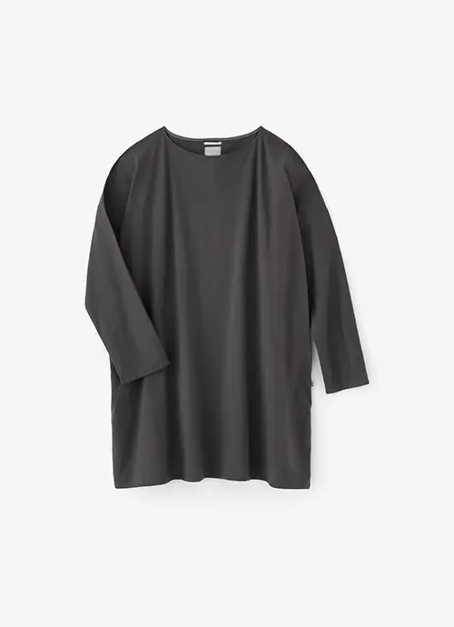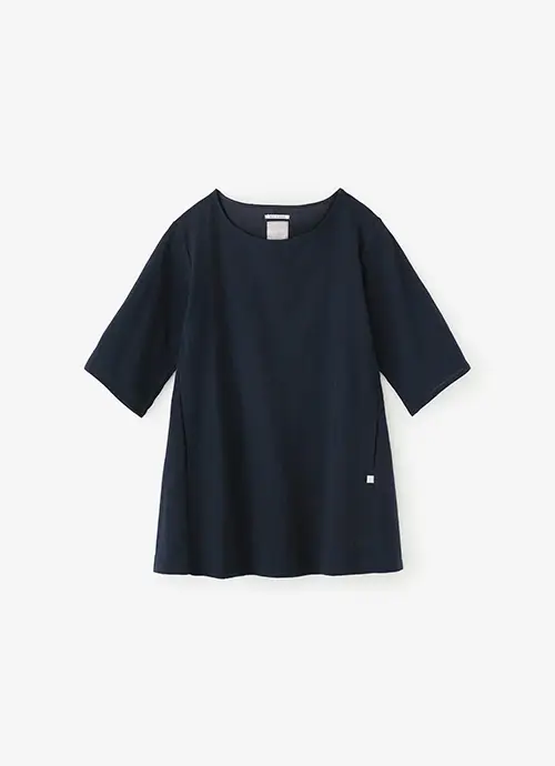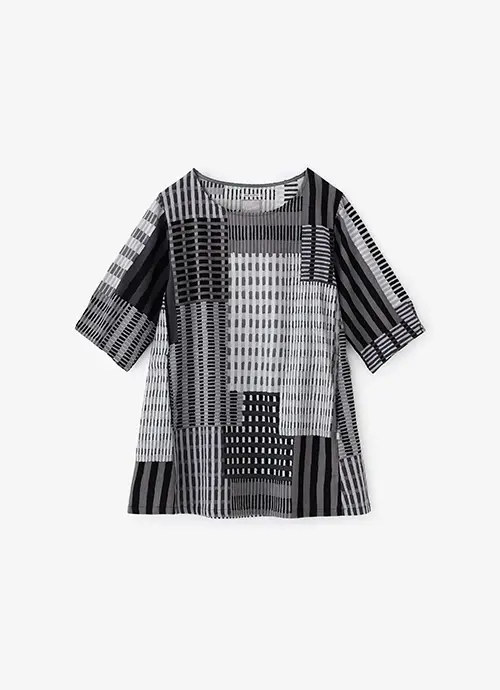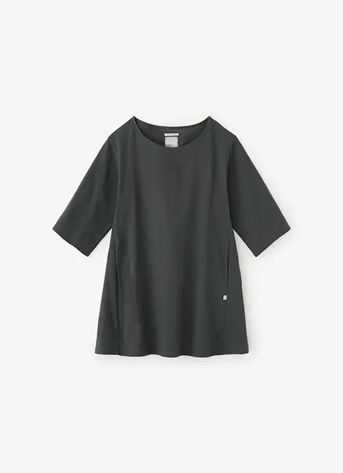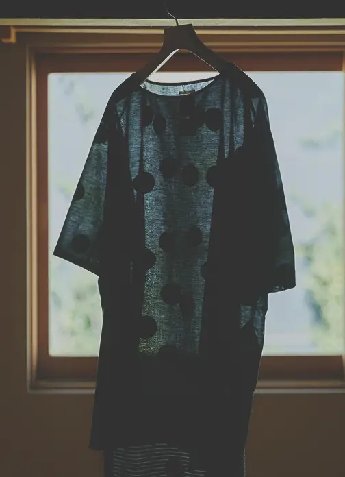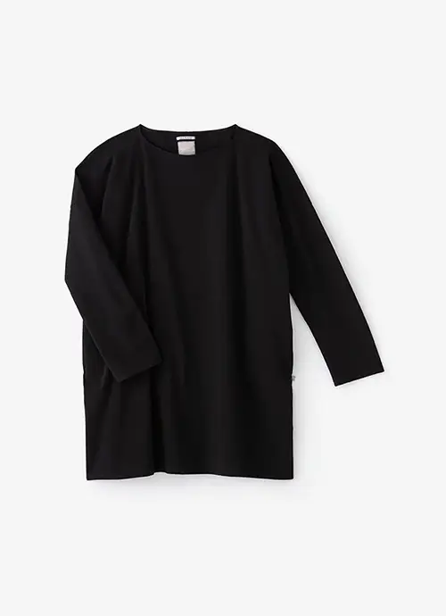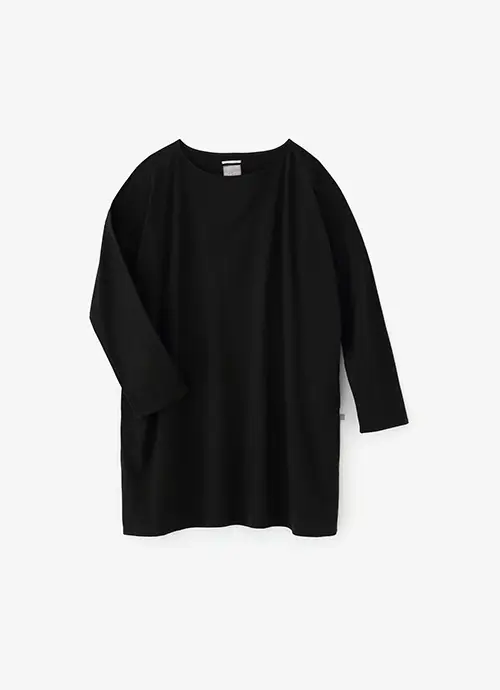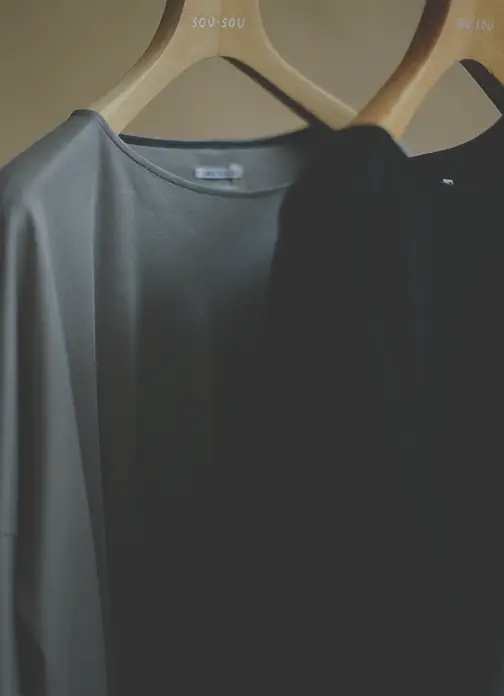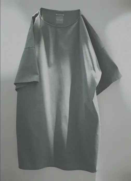 着心地抜群のTシャツはモノトーンでシックに。素材は高温多湿な日本の夏にも最適、「高島縮」。
